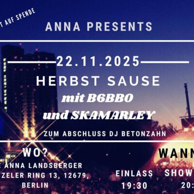 ANNA presents: HERBST SAUSE 2025! 🍂 Am 22. November 2025 verwandelt sich die JFE Anna Landsberger in Berlin wieder in die heißeste Partylocation des Herbstes! Freu dich auf einen Abend…
