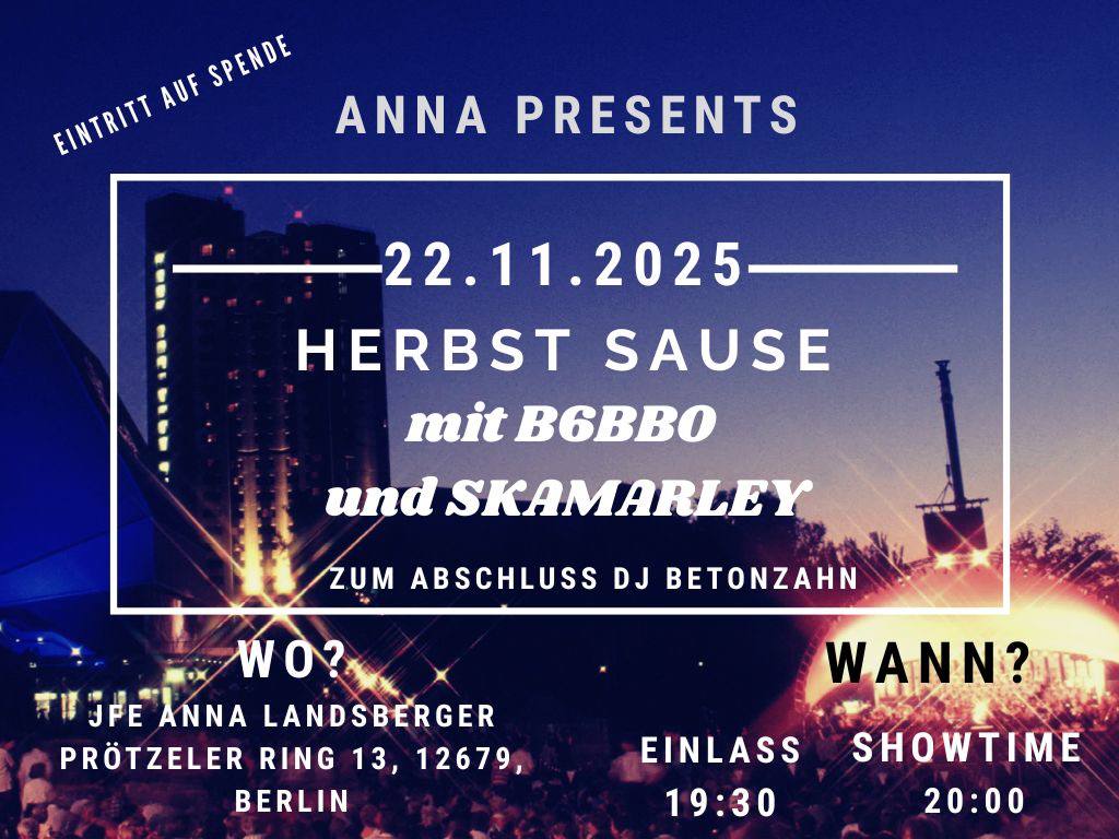 Anna Landsberger - internationales Jugendzentrum Prötzeler Ring 13, Berlin, GermanyANNA presents: HERBST SAUSE 2025! 🍂 Am 22. November 2025 verwandelt sich die JFE Anna Landsberger in Berlin wieder in die heißeste Partylocation des Herbstes! Freu dich auf einen Abend voller guter Vibes und bester Stimmung. 🔥 Live on Stage: 🎤 @b6bbo 🎶 @skamarley_official 🎧 DJ Betonzahn 📍 Ort: JFE Anna Landsberger Prötzeler Ring 13,...