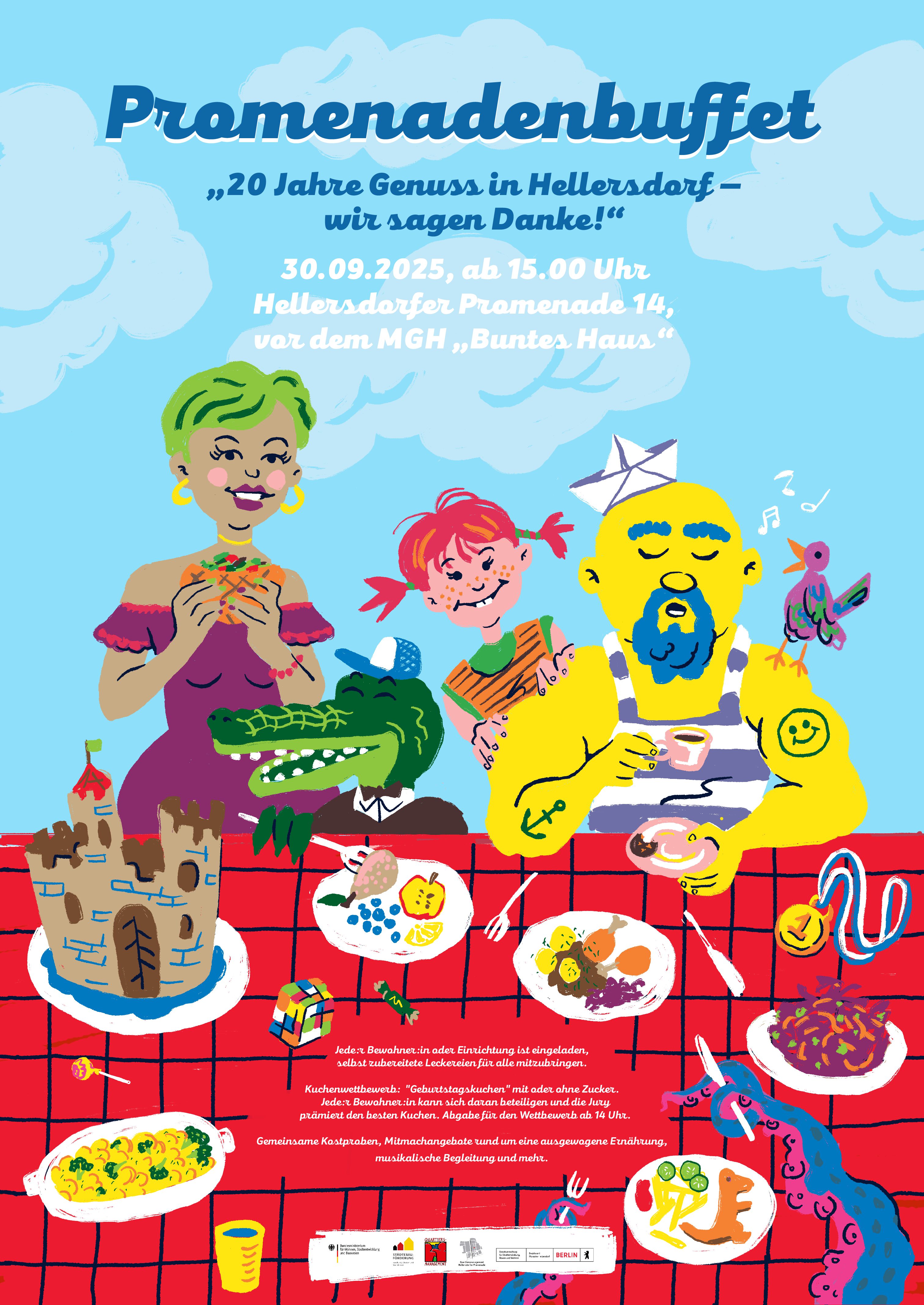 Am 30.09.2025 feiern wir unser 20jähriges Jubiläum des traditionellen "Promenadenbuffets". Wir laden Sie herzlich ein mit uns gemeinsam zu feiern und zu genießen. Zwischen 15-18 Uhr wird es vor dem MGH "Buntes Haus" (Hellersdorfer Promenade 14, 12627 Berlin) lecker, bunt und lustig. Es erwarten Sie leckere Kuchenkreationen, ein buntes Buffet, viele Stände mit verschiedenen aktiven...