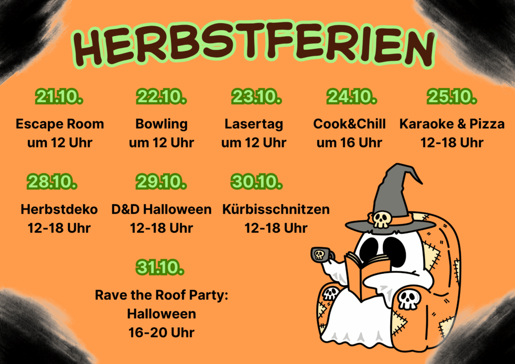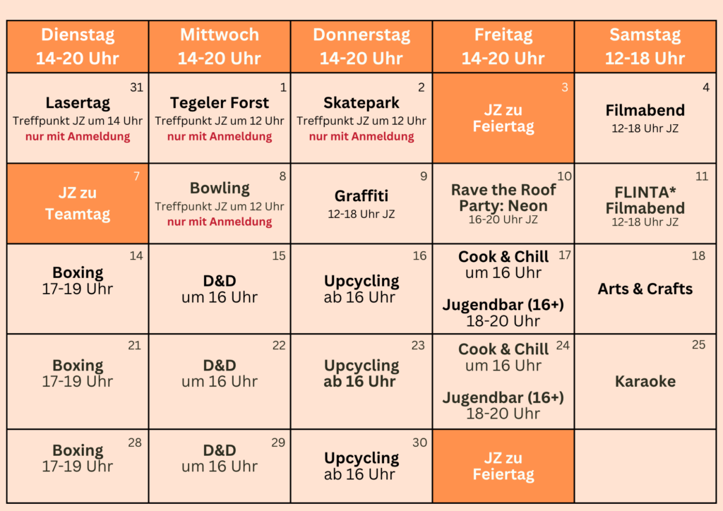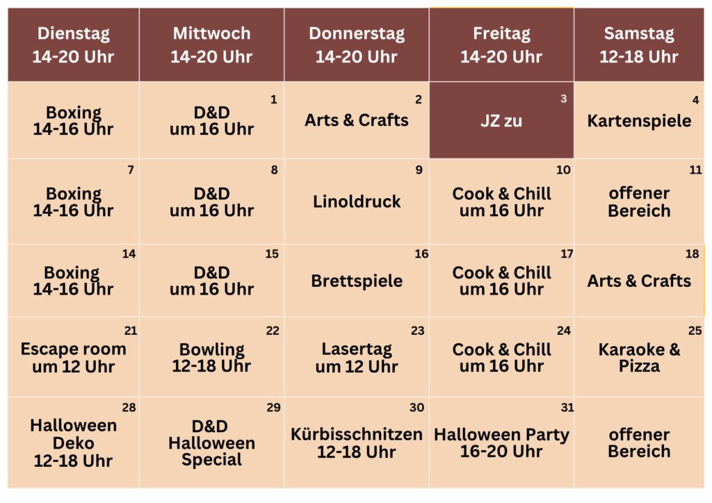 Zusätzlich bieten wir einmal im Monat samstags eine besondere Veranstaltung an. Das können Ausflüge, Besuche spannender Orte, spezielle Workshops oder Partys im Jugendzentrum sein.