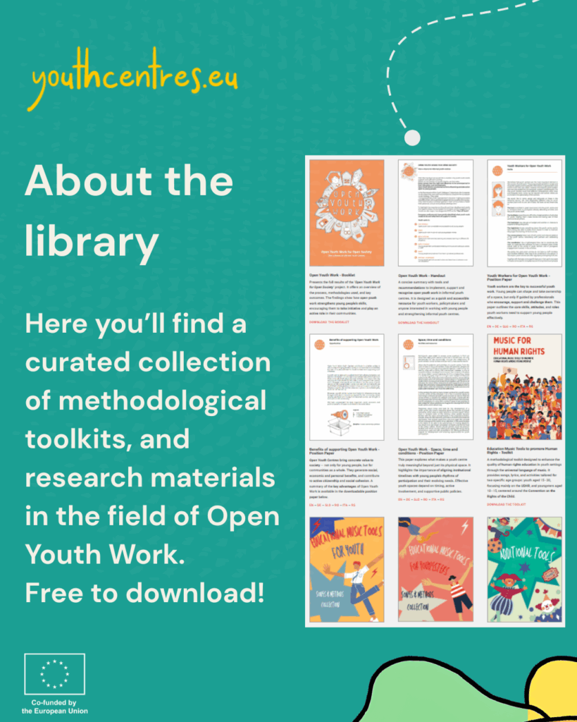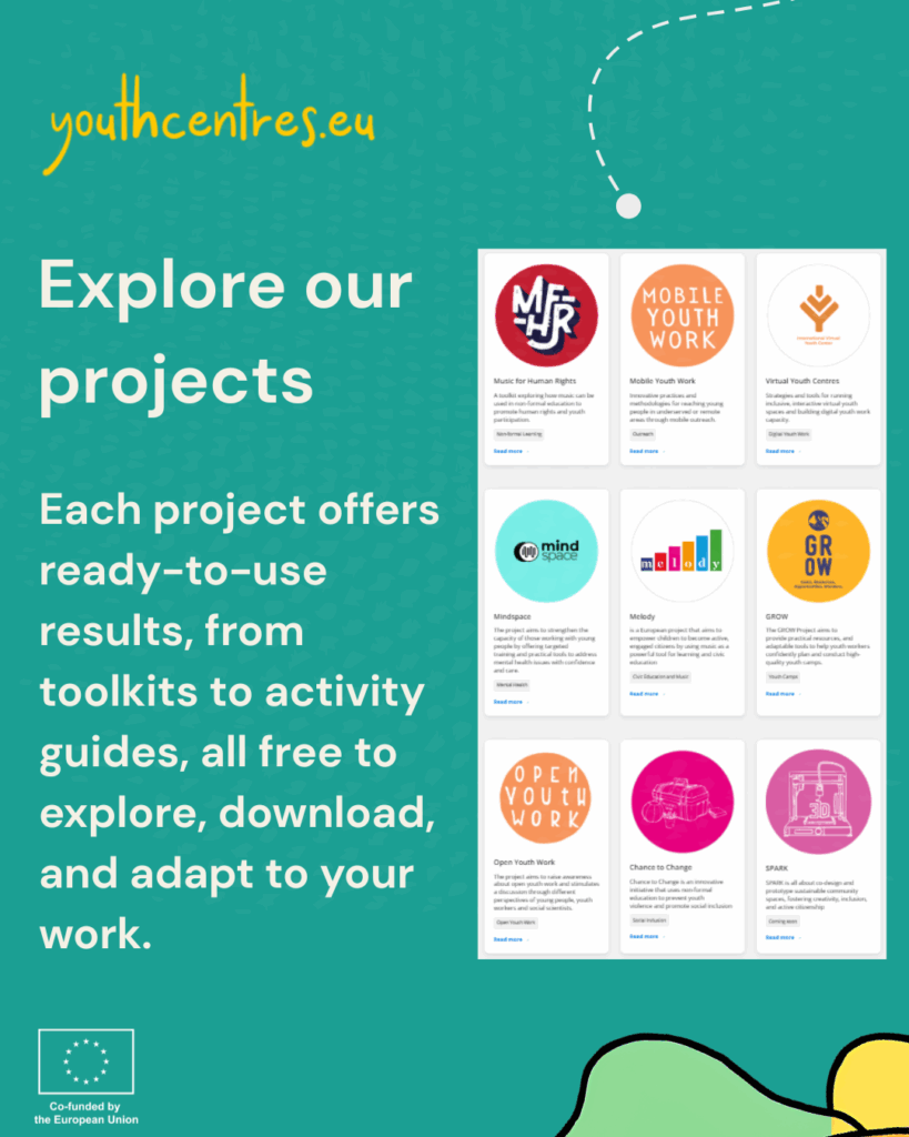Die Website wurde im Rahmen verschiedener Erasmus+ Projekte entwickelt und von der Europäischen Union kofinanziert. Alle Inhalte sind kostenlos zugänglich, zum Entdecken, Herunterladen und Anpassen – einfach vorbeischauen: youthcentres.eu.